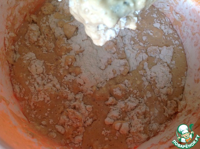 Далее мука и разрыхлитель, взбиваем