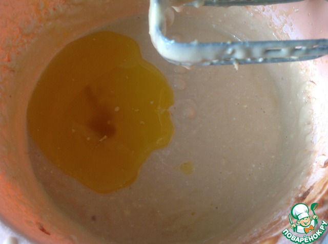 Добавляем растопленое и уже остывшее масло, взбиваем