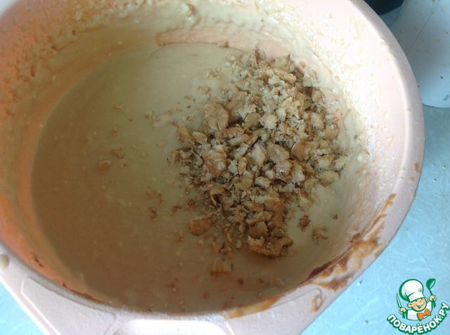 Орехи прокатать скалкой, не делаем их очень мелкими, добавляем к тесту и аккуратно перемешиваем лопаткой