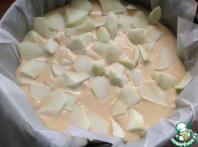 В форму выстеленную пекарской бумагой выкладываем тесто, сверху произвольно нарезанные кусочки очищенных яблок. Отправляем пирог в духовку на 40 мин при 180 гр