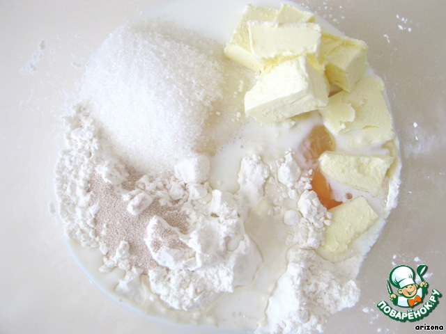 Смешать 300 г муки с 1 ч.л. дрожжей. Добавить 1 яйцо, 75 г сахара, 1 пакетик ванильного сахара, щепотку соли, молоко и 65 г сливочного масла комнатной температуры.