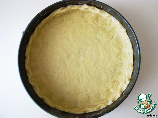 Тесто обмять (оно чуть увеличивается в размере и становится более эластичным), раскатать на посыпанном мукой столе и выложить в смазанную жиром форму (26 см), сделав небольшие бортики. Оставить на 15 минут.