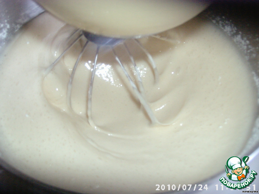 Теперь добавляем просеянную муку и разрыхлитель, хорошо взбиваем наше тесто