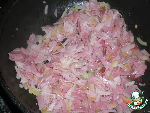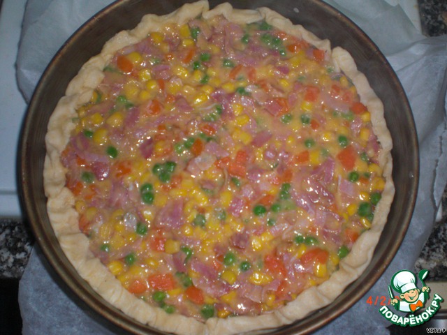 Займёмся начинкой, на масле поджарить порезанную небольшими кусочками ветчину и лук, добавить замороженные овощи, наборы в пакетах, у меня были кукуруза, горошек и морковь, пожарить немного, посолить, поперчить, добавить 2 ст.л. муки, тщательно размешать и снять с огня. Яйца очень тщательно размешать с молоком, посолить, вылить в овощную массу, немножко оставить - меньше полстакана. (Есть рецепт и без яиц, только мука и молоко, но я не пробовала).