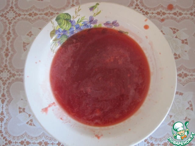 Для придания тесту аромат клубники и другой оттенок, клубнику протираем и процеживаем
