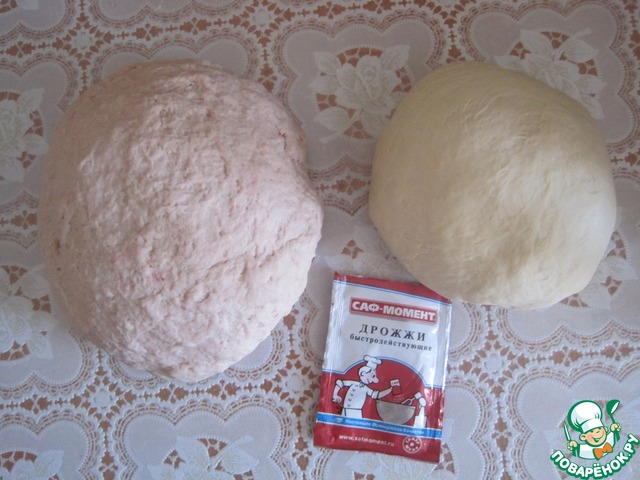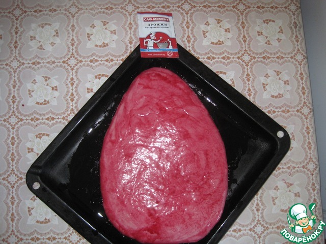 Замешиваем 2 вида дрожжевого теста: одно на молоке, другое на соке клубники. Молоко и клубнику подогреваем растворяем соль, сахар, добавляем яйцо, ванилин, муку. Вымешиваем однородное тесто и в конце сливочное масло. Оставляем на растойку. К сожалению тесто с клубникой не дало желаемого красного оттенка, но аромат теста потрясающий.