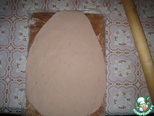 Тесто укладываем на доску с пакетом, чтобы потом без повреждения пирога переложить на противень.