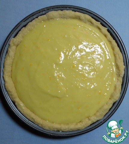 Тесто выложите ровным слоем с небольшим бортиком в смазанную растительным маслом форму для выпекания (размер формы 22/24 см). Затем выложите на тесто охлажденный крем.