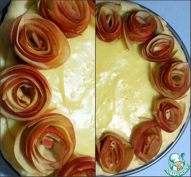 Яблоки нарежьте с помощью овощечистки на небольшие ленты, но не нужно делать их слишком тонкими, они просто засохнут при выпечке. Сформируйте из яблочных лент розы и выложите их на крем по краю формы, слегка вдавливая.