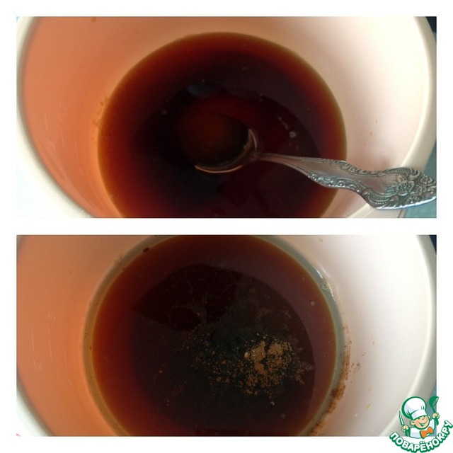 Добавить мед и сахар, перемешать до полного их растворения. Затем добавить масло и все специи, перемешать