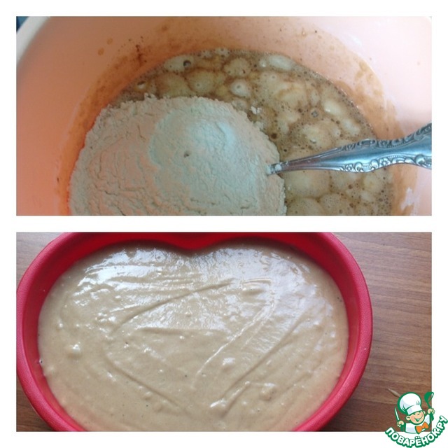 Добавить разрыхлитель с мукой, и аккуратно но тщательно все перемешать, чтобы не было комочков. Тесто выложить в форму и выпекать 30-40 мин при 180 гр