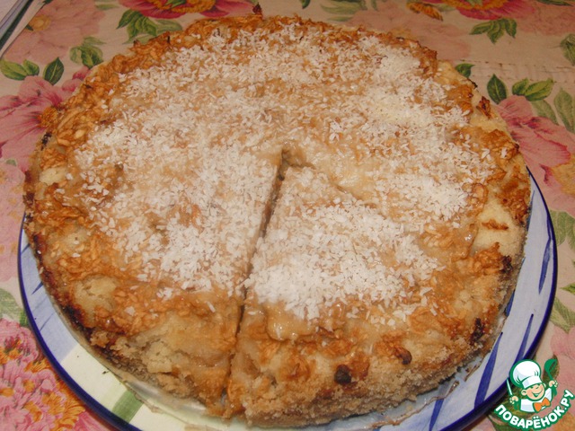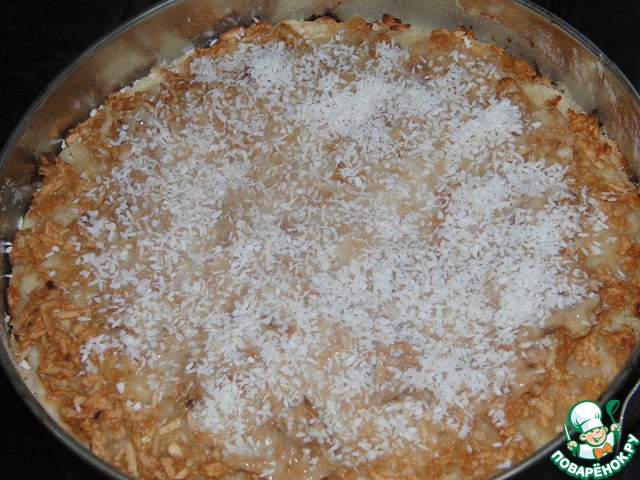 Выкладываем пирог на тарелку, смазываем его глазурью и посыпаем кокосовой стружкой...