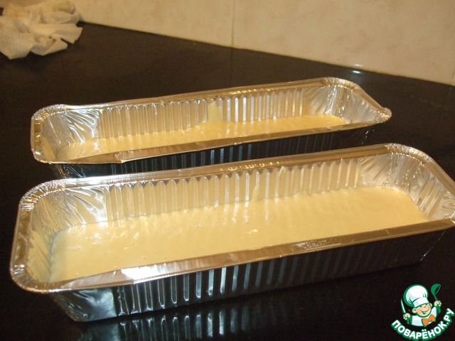 Делим визуально пополам и разливаем в 2 формочки (у меня инглиш кейк).