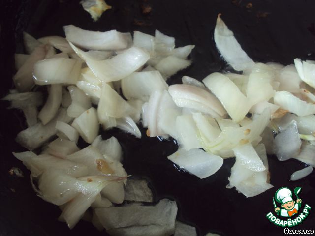 Лук нарезать, обжарить.