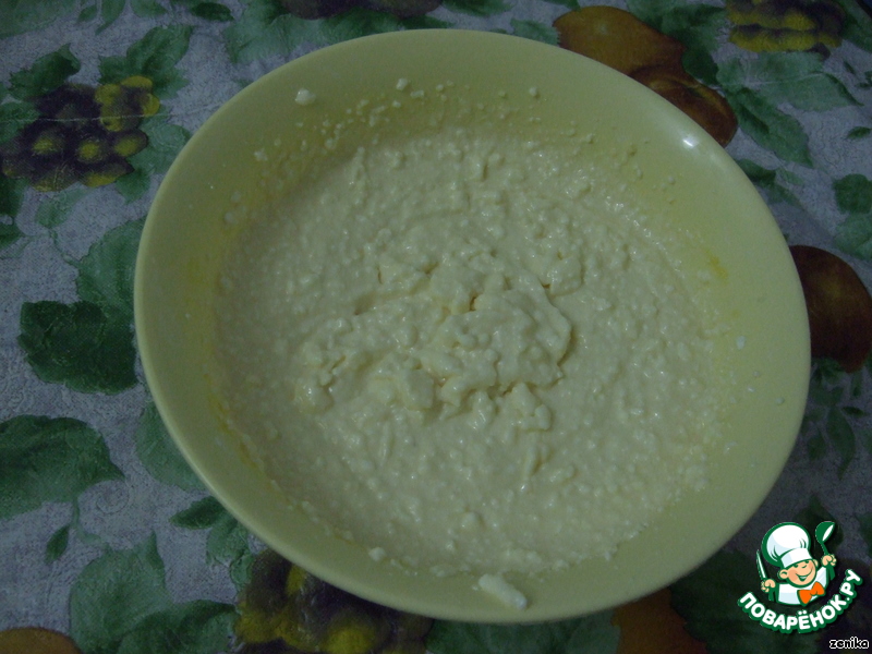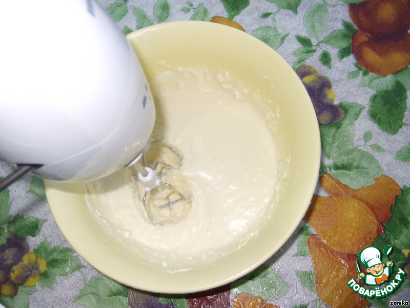 Пока корж в духовке займемся начинкой. Творог, 0,5 стакана сахара, ванильный сахар взбиваем миксером. Добавляем в начинку желтки и опять взбиваем.