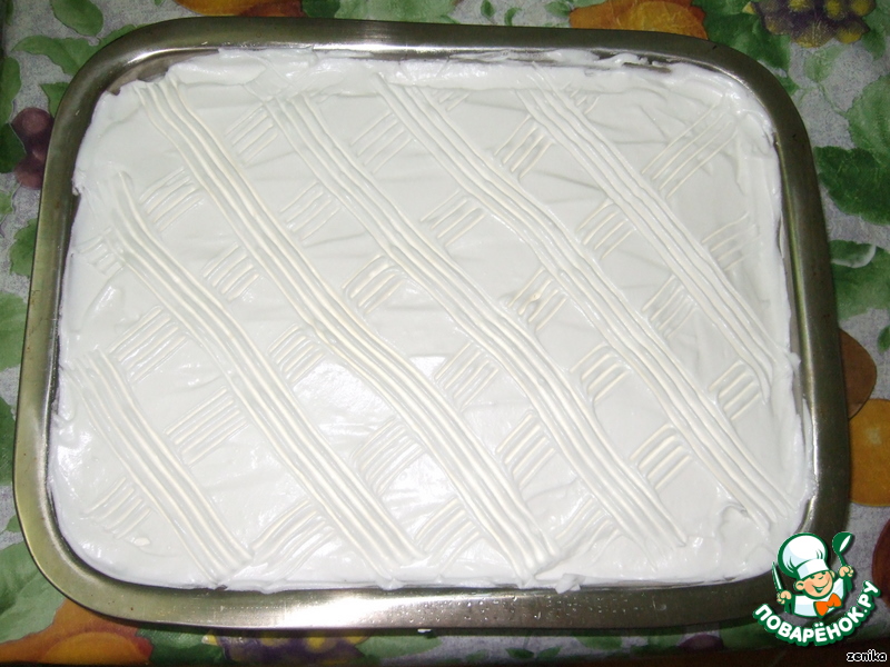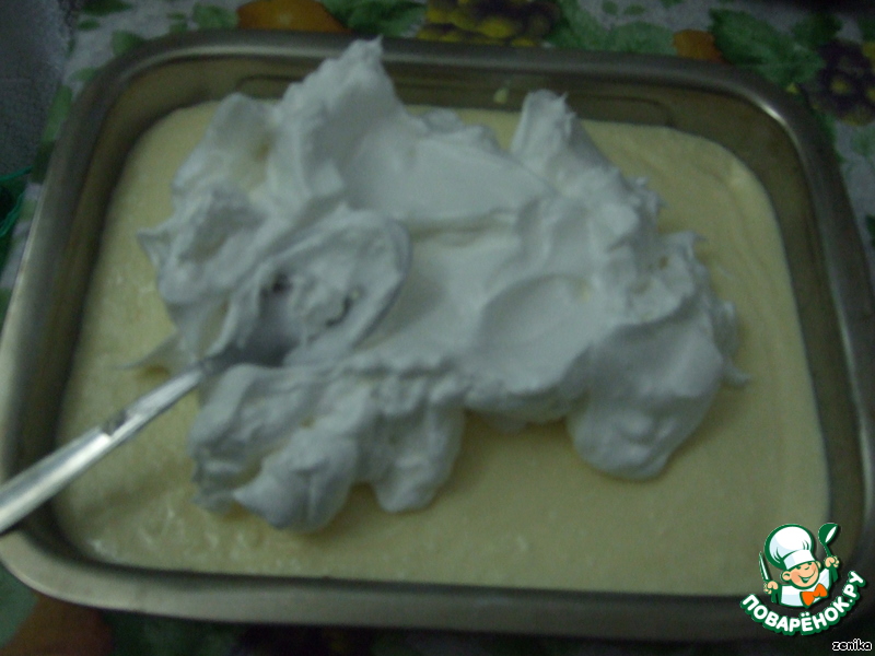 После того, как достали из духовки корж, сразу выкладываем на него творожную начинку, а сверху белковый крем.