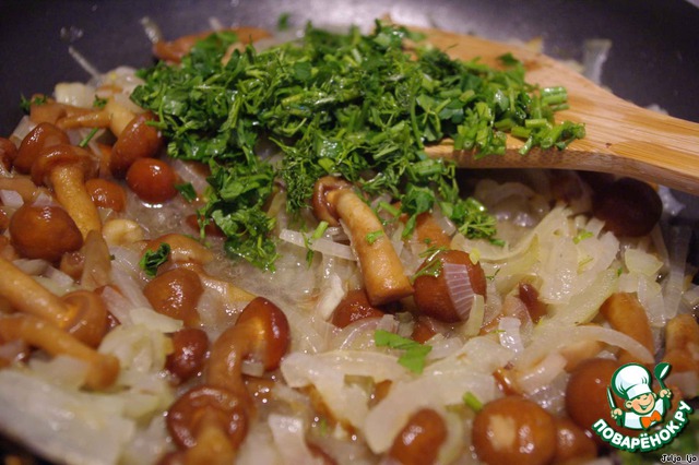 Добавляем опята (размороженные), обжариваем вместе 2 минуты.