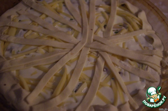 Оставшееся тесто нарезаем полосками, выкладываем на пирог в произвольном порядке.