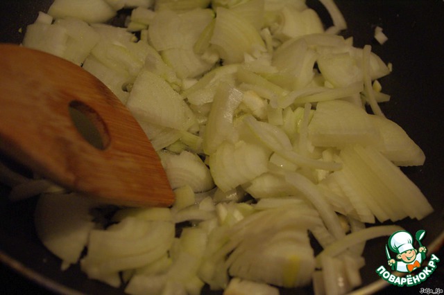 Для начинки лук нарезаем соломкой и обжариваем на растительном масле до полуготовности.