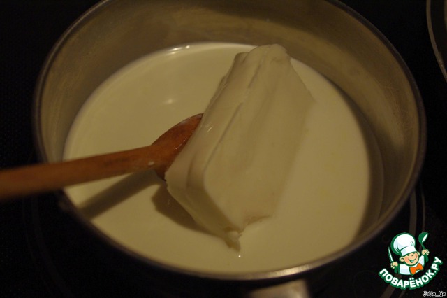 Сливки ставим на огонь, подогреваем, добавляем сыр. Помешивая, на среднем огне, расплавляем сыр в сливках.