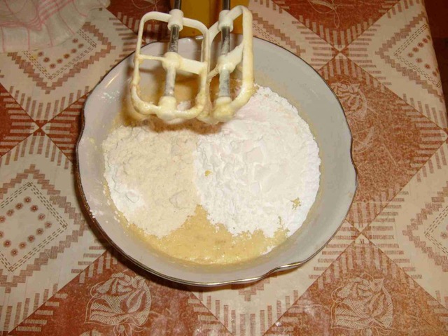 Добавить муку (кукурузную и рисовую), соль, разрыхлитель, хорошо вымешать
