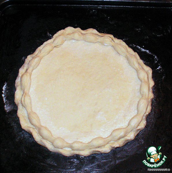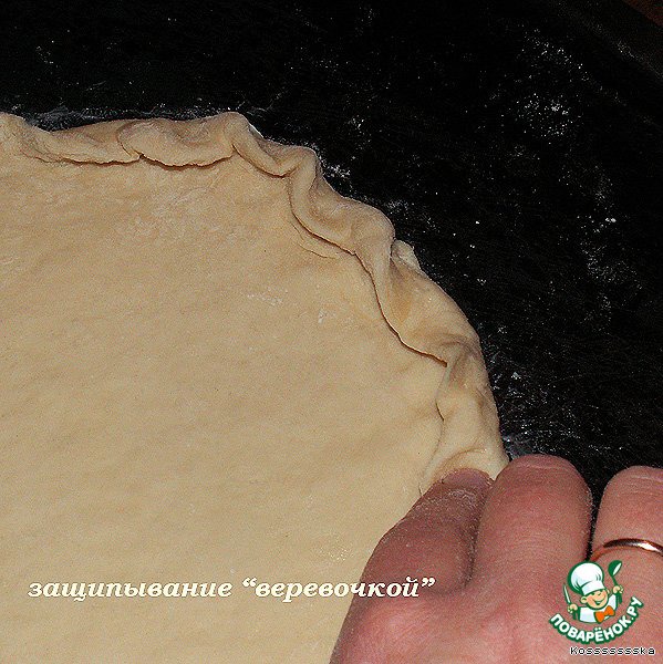 Защипываем край «веревочкой», чтобы когда станет течь сок, хоть что-то его притормозило на пути к противню.