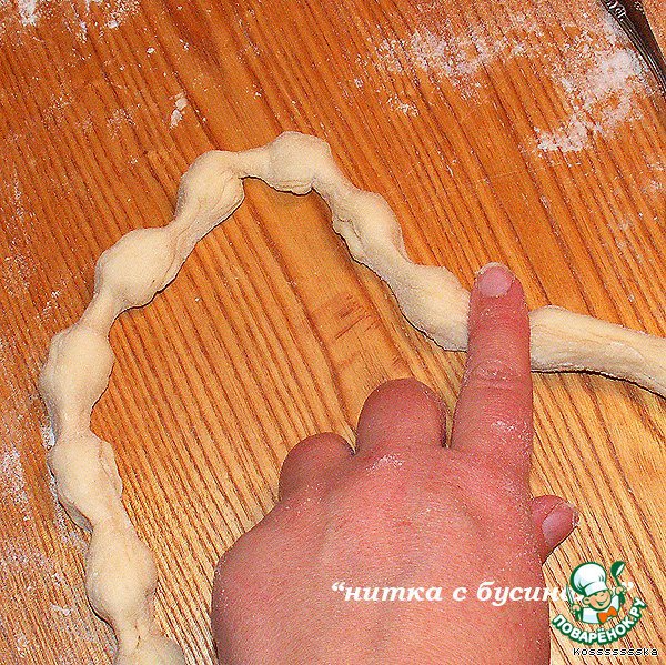 Затем из теста для украшения катаем жгут толщиной с палец и через промежутки, равные толщине жгута, защипываем и прокатываем пальцами, чтобы получилась «нитка с бусинками». Край лепехи, вплотную к защипанному краю, смазываем водой с помощью кисточки. Укладываем нашу "нитку с бусинками" на смазанное место. В этот момент мы видим, что лепеха поднялась, и приминаем серединку – иначе ягодный сок не даст толщине пропечься.