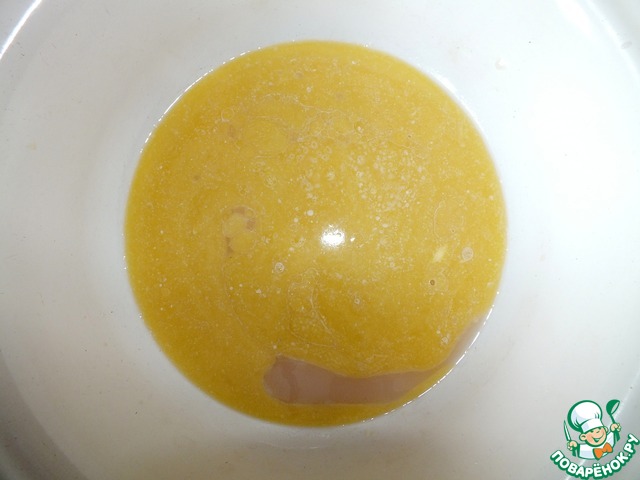 Для начала разведем дрожжи в теплой воде. Добавим сахар, соль. Размешаем. Затем введем яйца, растопленное сливочное масло, растительное масло.