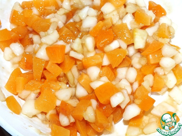 Тем временем сделаем начинку. Яблоки очистим от кожуры и нарежем кубиком. В сковороде смешаем яблоки, коричневый сахар, крахмал и воду. На маленьком огне потушим эту массу до мягкости яблок