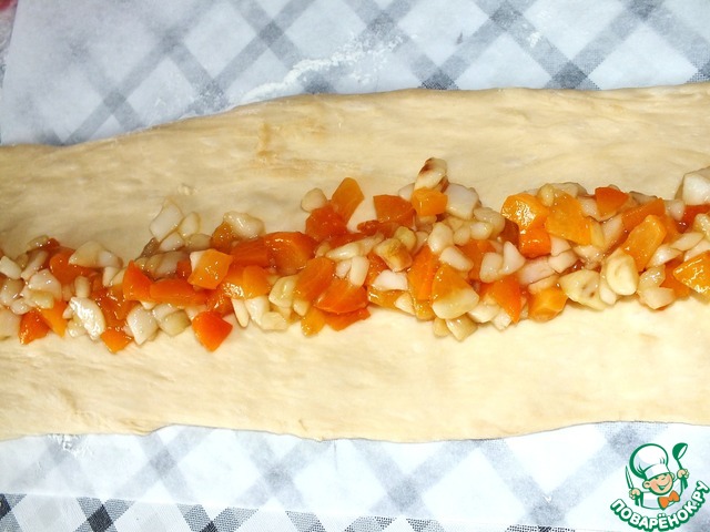 Подошедшее тесто обомнем и раскатаем на присыпанном мукой столе в длинный прямоугольник. (я еще подложила бумагу для выпечки, чтобы удобнее было переносить пирог на противень). На тесто распределим начинку и хорошо защипнем края