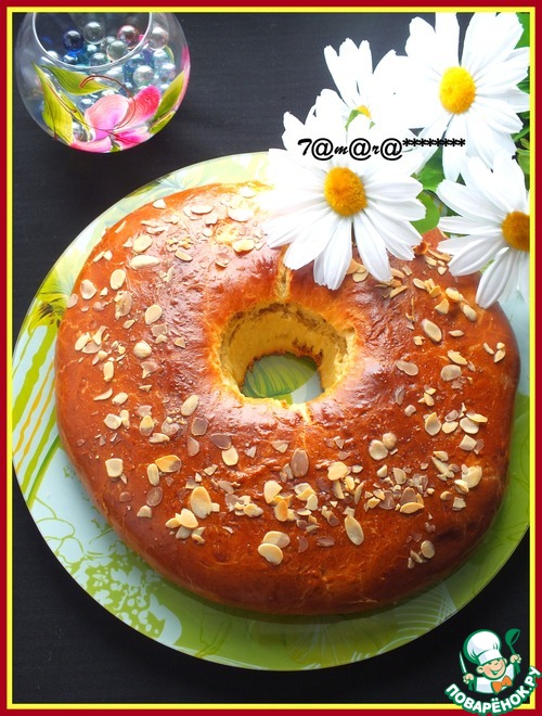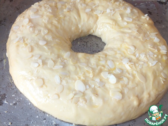 Тесто аккуратно перенесем на смазанный противень и сформируем кольцо (соединив стык). Накроем полотенцем и оставим на расстойку минут на 15-20