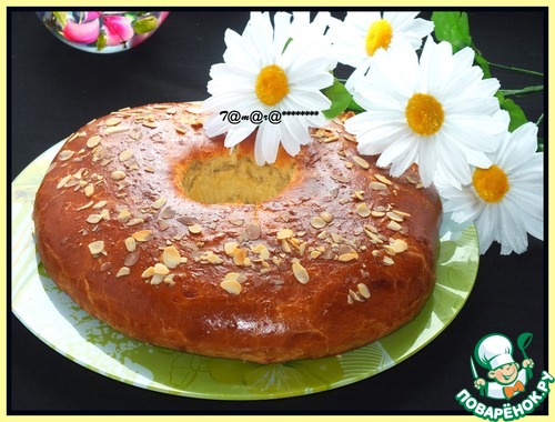 Затем смажем взбитым яйцом и сверху украсим миндальными лепестками. Выпекаем пирог в горячей духовке при t=180* 30-35 минут до готовности.