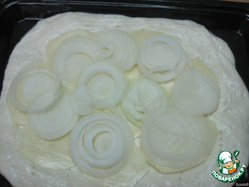 на тонко раскатанный лист теста, смазанный сливочным маслом, выложить картофель, нарезанный кругами, и лук