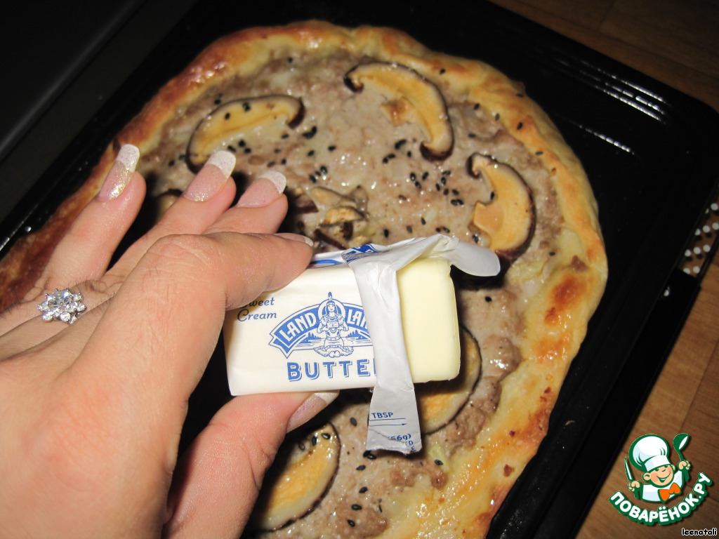 сначала ставим на нижнюю полку в духовке, чтобы поднялось тесто, на 5 мин.; потом на 15 мин на среднюю, потом на 5 мин. на верхнюю, чтобы подрумянилось, потом вытащить, смазать сливочным маслом, обязательно и грибы, и сам пирог, чтобы не были сухими