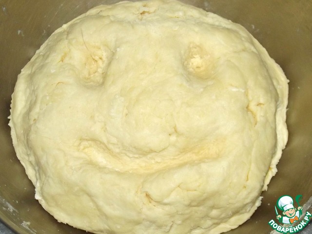 Соду погасить в сметане, добавить в полученную крошку, также добавить 2 яичных желтка. Замесить слегка липкое тесто.