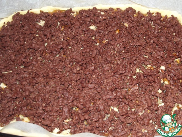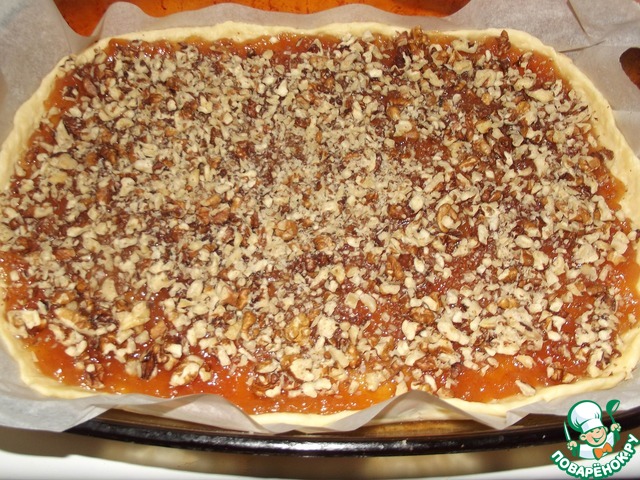 Распределить грушевый джем, посыпать дробленными грецкими орехами. В процессе выпечки они пропитаются джемом и станут невероятно вкусными.