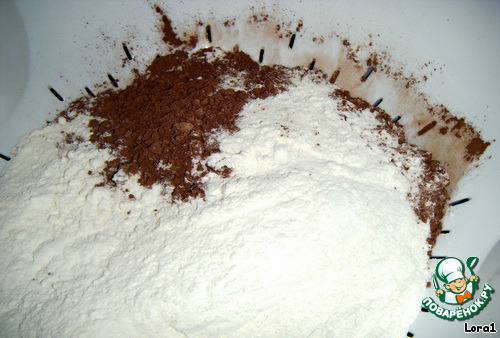 4. Муку смешать с разрыхлителем и какао, просеять и смешать с остальной смесью -
