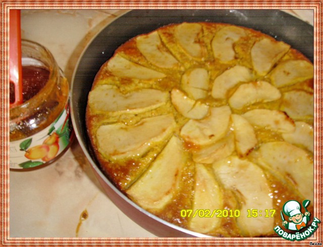Готовый пирог смазать теплым абрикосовым джемом. Дать остыть, затем посыпать сах. пудрой.