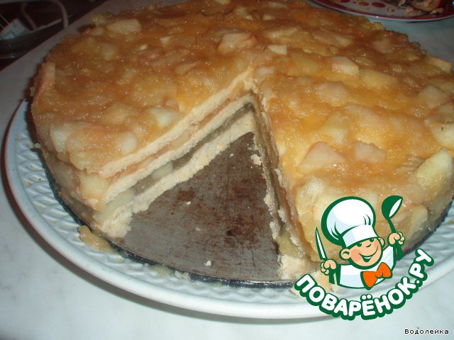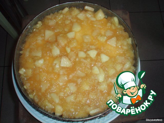 В одну из тарелок с яблочным пюре высыпать содержимое 1пакета желе и быстренько хорошо перемешать. И сразу же выложить на корж( прямо горячим). Сверху положить второй корж и поступить точно так же со второй тарелкой яблочного пюре. Дальше третий корж и проделать то же с третьей тарелкой пюре.