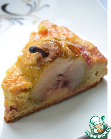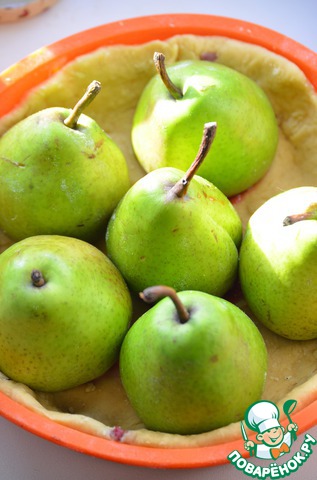 На дно формы установить груши хвостиками вверх, залить жидким тестом. Выпекать в духовке при 180С 30-40 минут, готовность проверить деревянной шпажкой (верх пирога я обмазала кондитерским гелем )