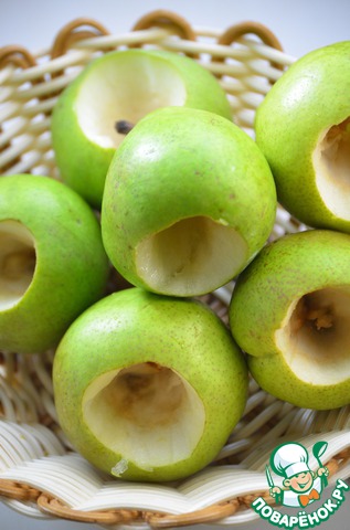 С утолщенной стороны груши аккуратно вырезать сердцевину, оставив целыми хвостики, сбрызнуть соком лимона