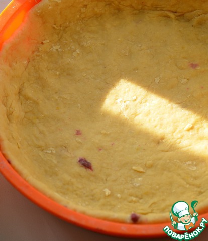 Отделить 1/3 часть теста, понемногу, постоянно вымешивая, всыпать столько муки, чтобы получилось мягкое тесто. Раскатать его в круглый пласт, выложить в смазанную форму, делая высокие бортики
