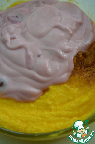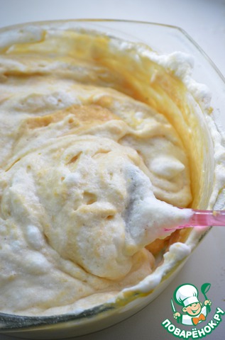 Желтки отделить от белков, растереть с сахаром и размягченным маслом, добавить тертую на мелкой терке цедру лимона, йогурт, корицу, перемешать
