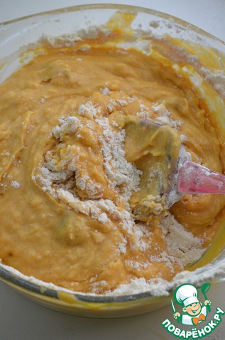 Всыпать 1 стакан муки и разрыхлитель, хорошо перемешать