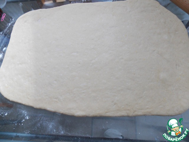 Готовое тесто выкладываем на подпыленный мукой стол и раскатываем в прямоугольник примерно 45см х 30см.