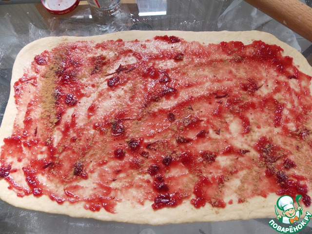 Смазываем джемом (у меня был брусничный) и посыпаем корицей. Варенье я не рекомендую здесь использовать: оно жидкое и вытекает. Джем, в отличие от варенья, имеет очень плотную консистенцию за счет содержащегося в нем пектина, и остается на месте во время формовки и выпечки.