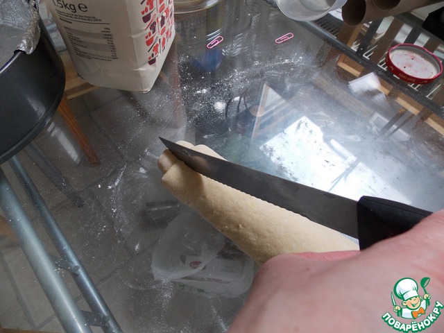 Теперь сворачиваем прямоугольник рулетом (насколько возможно плотно). Острым ножном разрезаем рулет вдоль по всей длине.