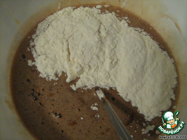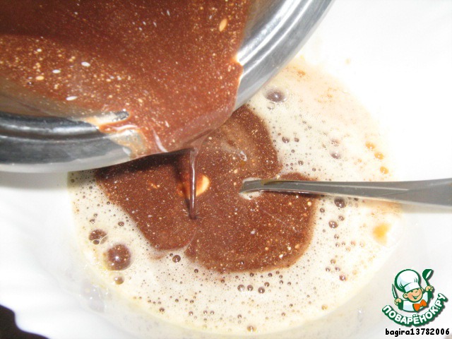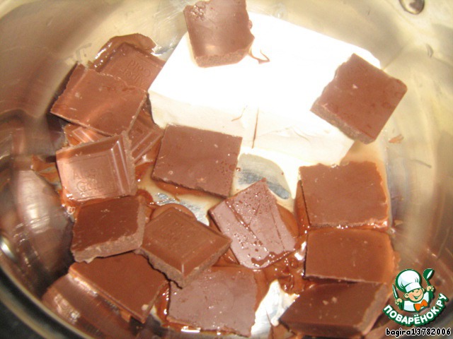 Растопить масло и шоколад (можно взять темный) в СВЧ. Я растапливала на плите.