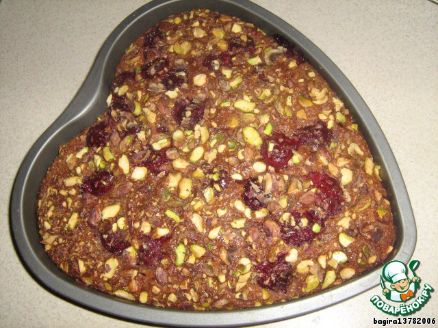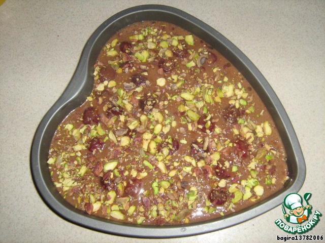 Вылить тесто в выложенную пергаментом форму (20--22 см в диаметре) и посыпать фисташками.