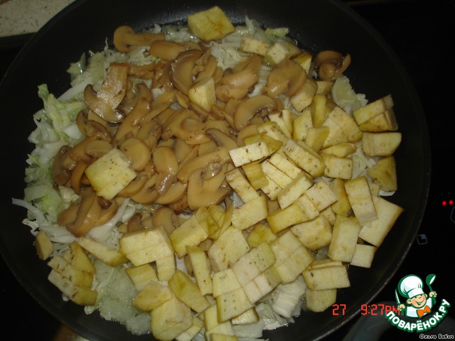 Прожарим капусту, грибы, баклажан на растит.масле до готовности, в конце добавить тертый помидор. Масло слить и дать остыть!